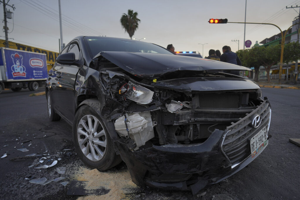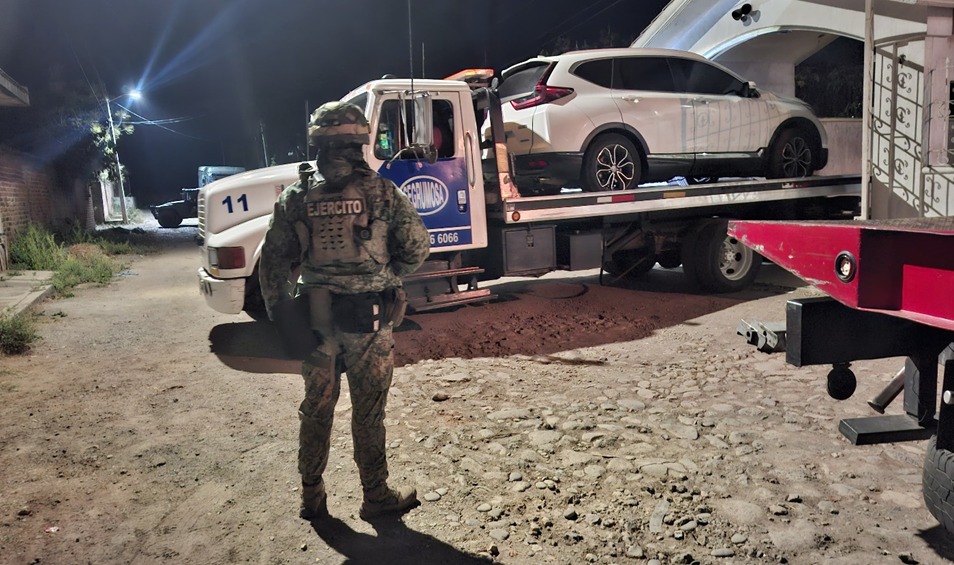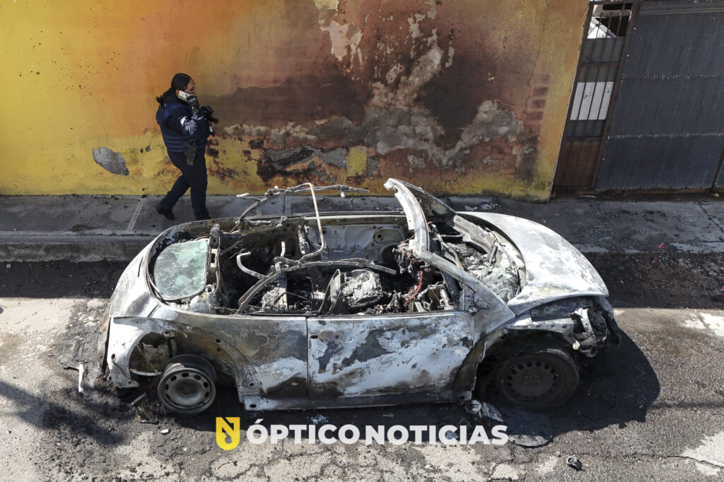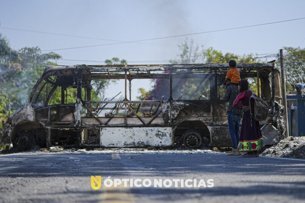 Una familia Nayeri, observa un camión urbano completamente calcinado, mismo que fue utilizado para bloquear la carretera estatal numero 76, a la altura del poblado del aguacate, en el municipio de Tepic.